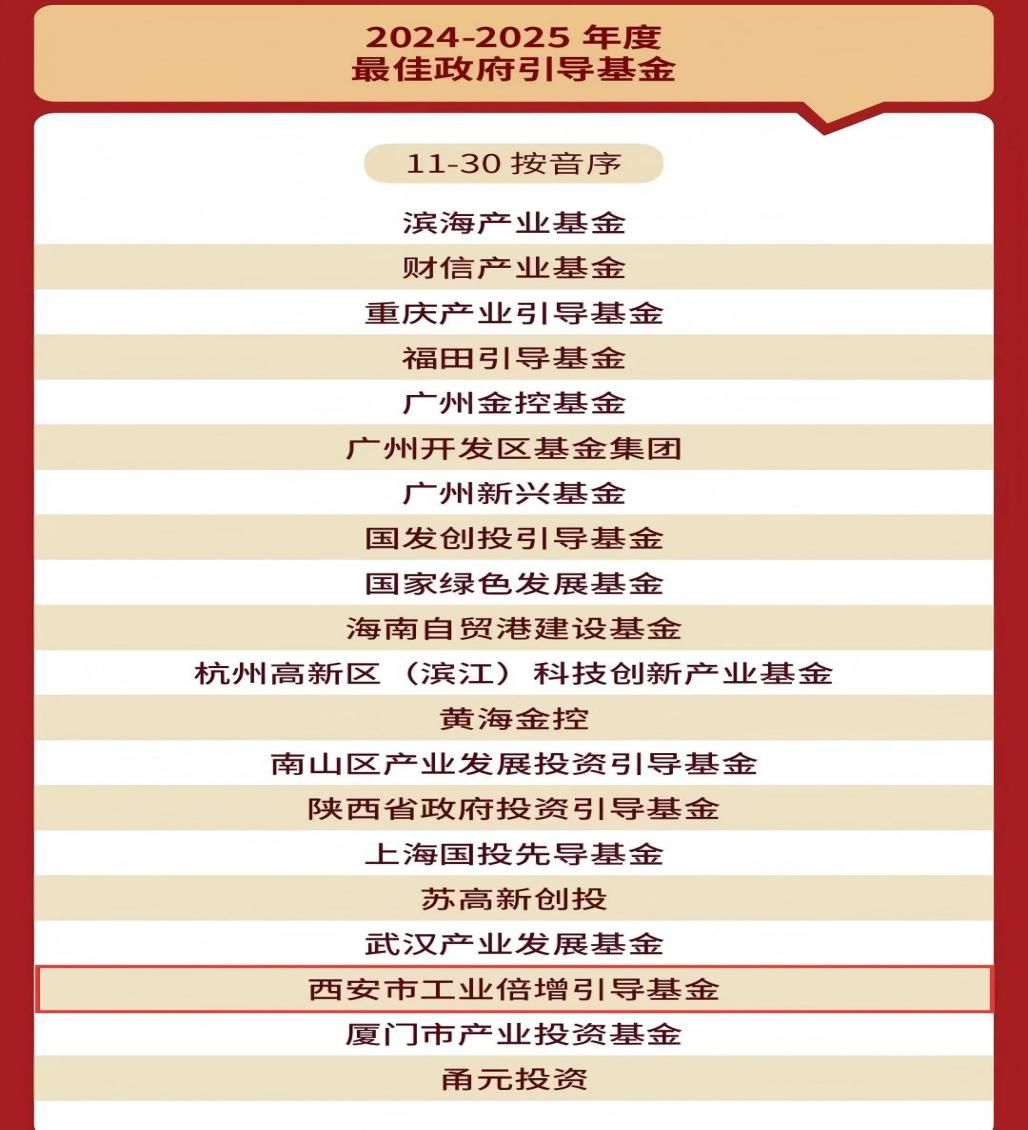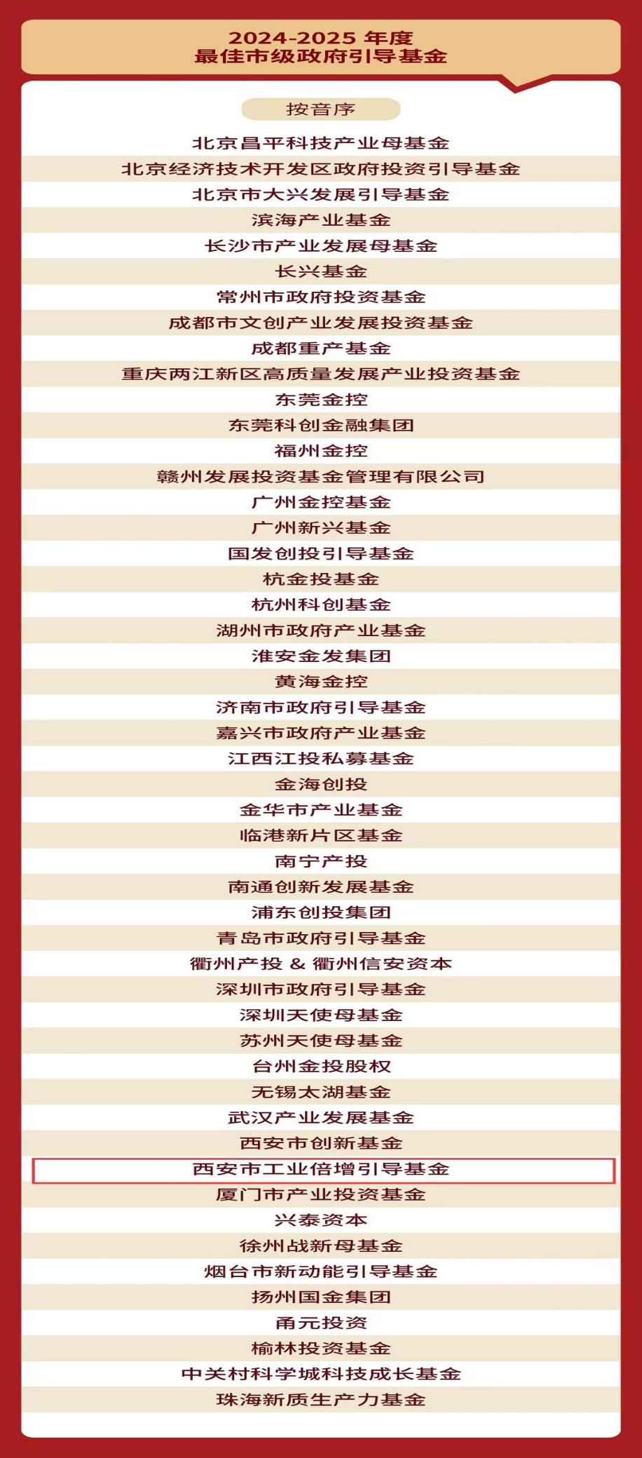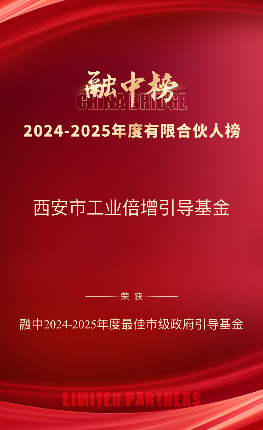 2025年7月23日,融中發(fā)布2024-2025年度有限合伙人榜單。由西安投資控股負責(zé)市場化運作的西安市工業(yè)倍增引導(dǎo)基金榮獲“2024-2025年度最佳政府引導(dǎo)基金”“2024-2025年度最佳市級政府引導(dǎo)基金”。這是繼獲得清科“2025年中國政府引導(dǎo)基金50”“2025年中國地市級政府引導(dǎo)基金30強”榜單后,西安市工業(yè)倍增引導(dǎo)基金今年斬獲的又一行業(yè)權(quán)威榮譽。